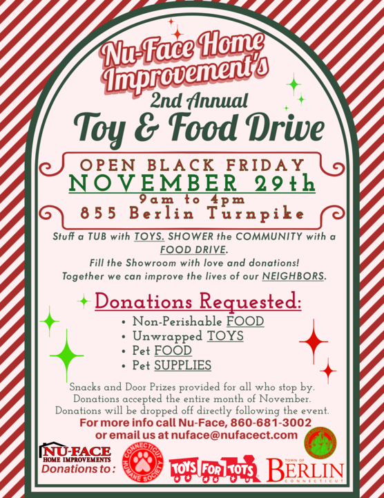Join Nu-Face Home Improvement on Black Friday, November 29th for their 2nd Annual Toy & Food Drive! From 9 am to 4 pm at 855 Berlin Turnpike, bring the holiday spirit to life by donating essential items to help neighbors in need. This event welcomes contributions such as non-perishable food items, unwrapped toys, pet food, and pet supplies.